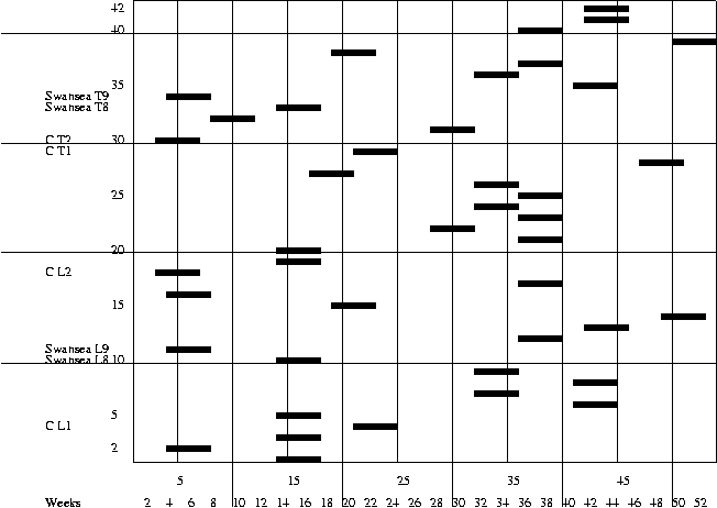 Not only is this a low cost schedule (it has a cost of 616MW weeks) but it is a good one in that it contains several ``sensible'' decisions, for example performing maintenance on lines and the transformers which supply them simultaneously. For example line ``Swansea L9'' and transformer ``Swansea T9'' which supply Swansea, are both maintained in weeks 4-7.