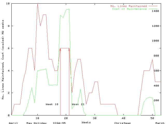 The most recent approach is to retain the fixed network ordering of processing the tasks but allow the scheduler to change its mind and reschedule lines. This is allowed by repeatedly calling the evolved program, so having processed all 42 tasks it called again for the first, and then the second, and the third and so on. Processing continues until a fixed CPU limit is exceeded (cf. PADO [Teller and Veloso,1995]). These alternative techniques were able to produce maintenance schedules but they had higher costs than those described in Sections C.8 and C.9.6.