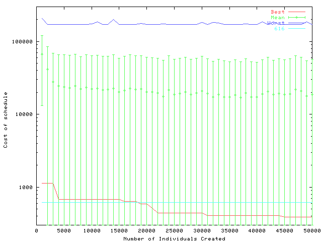 Selection | Pareto Tournament group size of 4 (with niche sample size 81) used for both parent selection and selecting programs to be removed from the population. Pareto components: Schedule cost, CPU penalty above 100,000 per line, schedule novelty. Steady state panmictic population. Elitism used on schedule cost. |