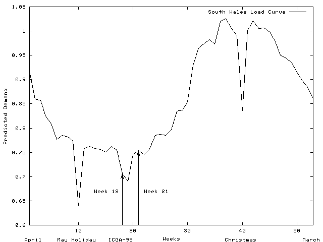 The constants of proportional, K and S need to be chosen so that the maintenance benefit dominates. For the four node problem this was done by calculating the line costs associated with many feasible schedules [Langdon,1995, page 140]. This gave the highest feasible line cost as being 3870MW weeks. K was set to 4,000 MW weeks, so that any schedule which failed to maintain even one line would have a higher cost that the worst ``reasonable'' schedule which maintains them all.