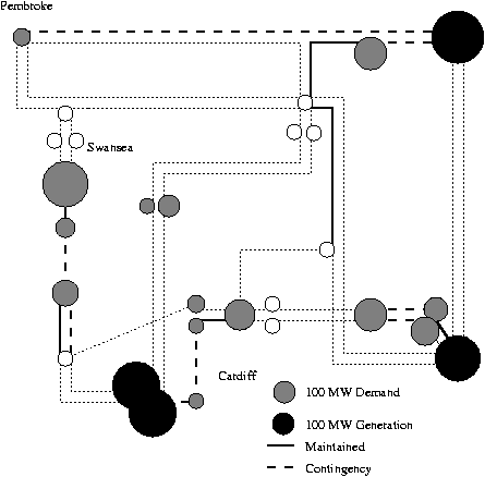The NGC network contains about ten times as many nodes and lines as the South Wales network and requires approximately three times as many maintenance activities to be scheduled than we considered in this chapter. In this chapter we considered all possible single and double fault contingencies. In practice run time consideration mean a study of the complete network is unlikely to consider all possible contingencies.