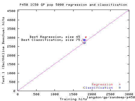 Best of 5 regression runs and 5 classifications runs are plotted together with best simplified model of both GP approaches.