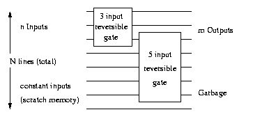 In normal operation data flows from left to right. However when reversed, garbage and outputs are fed into the circuit from the right to give the original inputs to the program (plus constants).
