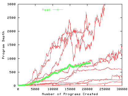 Figure 4 shows the average population depth varies widely between runs and in several runs the mean depth does not increase monotonically at a constant rate. However the mean of all ten runs is better behaved and increases at about 2.4 levels per generation.
