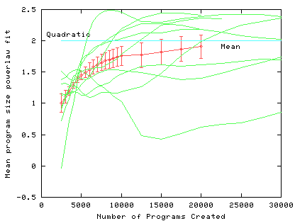 Figure 5 shows the coefficient obtained by fitting a power law to the evolution of mean size of programs from generation 12 to later generations. Again there is wide variation between runs but on average the exponents start near 1.0 (generations 12-50) and steadily rises to 1.9 (between generations 12 and 400). I.e. towards the predicted quadratic limiting relationship between size and time.