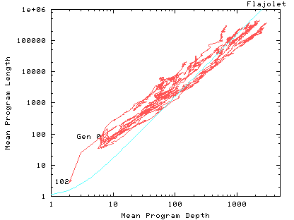 In nine of ten independent runs the population bloats. (In run 102 at generation 7, GP finds a high scoring program of one function and two terminals, which it is unable to escape from and the population converges towards it. After generation 35 approximately 90% of the population are copies of this local optima. Similar trapping is also reported in [Langdon1998b]). All populations complete at least 400 generations. However three runs stop before 600 generations when they reach the size limit (one million).